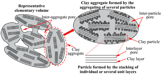 Clay represents a complex porous structural body, with clay layers and interlayer pores composing a basic unit of clay particles, such as montmorillonite lamellae and interlayer pores, as shown in Figure 9 [60]. Water in clay soils includes microstructural water and macro-structural water [64]. As shown in Figure 9, water in interparticle and interlayer pores is microstructural water, i.e., adsorbed water, and water in interaggregate pores is macrostructural water. The surface of the clay particle unit carries a negative charge, and a diffuse double layer is formed between the clay particles, such as the diffused double-electric-layer water layer at the crystallite scale, shown in Figure 4b. The clay particles and the inter-clay pores form the basic clay aggregate, then the aggregates and the inter-aggregate pores develop a representative basic clay unit. Consequently, the clay block can be roughly divided into interlayer pores, intergranular pores, and inter-aggregate pores at three levels of pore space, and fractures visible to the naked eye develop from the inter-aggregate pores.