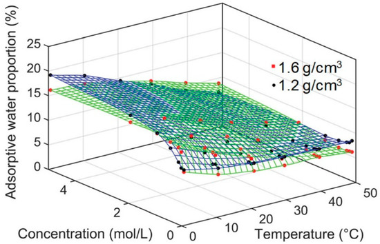 The adsorbed water content is simultaneously controlled by the pore solution concentration, which increases to the detriment of the adsorbed water [80]. It is clear that an increase in the pore solution concentration will inhibit the development of the bilayer thickness, according to Equation (3). However, the role of salt concentration on crystal layer swelling needs to be further investigated. As regards the changes in pore structure, the adsorbed water content is affected by the salt concentration in the same way as the micro-pore volume. Norrish et al. [86] concluded that, although salt concentrations less than 1 M have little effect on the swelling of crystalline layers, the increased electrolyte concentration leads to the dehydration of montmorillonite by osmosis, which is detrimental to the occurrence of inter-montmorillonite hydration. Thus, high salt concentrations have an inhibitory effect on hydration.