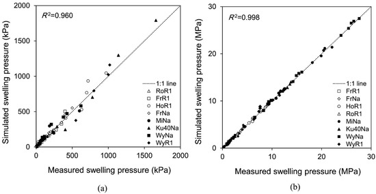 Comparison of measured and predicted swelling pressures for eight soils [93]: (a) low swelling pressure; (b) high swelling pressure [92].