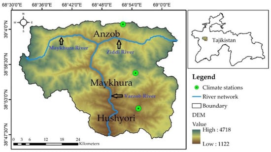 The mountainous Varzob River Basin in Tajikistan is the subject of this study. The landlocked nation of Tajikistan is situated in the southeast of Central Asia. The Tien Shan, Gissar-Alai, and Pamir Mountain systems make up approximately 93% of Tajikistan’s total area [7]. The elevation of Tajikistan’s land varies from 300 to 7495 m above sea level, and more than half of it is situated at an elevation of more than 3000 m [8]. Central Asia is thought to be a “hotspot” for climate change and one of the world’s largest semi-arid regions [9,10]. While mean precipitation based on some studies shows a slight increase [11,12], temperatures are rising faster than the global average [13,14]. Considering the intricacy of the domain and many atmospheric factors, regional patterns at the valley and district levels can substantially diverge from the global level. The growing demand for water for agriculture and hydropower generation in Central Asia contrasts with the shrinking resource base of the region [15,16].