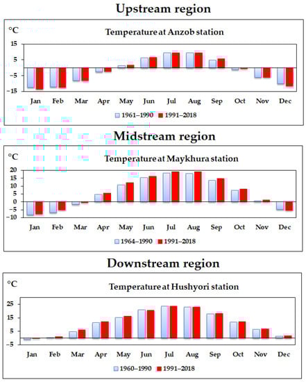 Table 2 shows the trend analysis of the average temperature in the upstream, midstream, and downstream areas of the VRB. In the Anzob region (upstream area), according to the observational data in this region, the mean temperature trend in the first period (1961–1990) was recorded in March, September, and November. However, with a relatively large difference in the second period (1991–2018), a considerable increase can be observed in most months of the year. In general, from 1961 to 2018, the average air temperature in January, May, September, October, and December recorded a significant trend. The mean temperature in the Maykhura region in the period from 1964 to 1990 in January and September revealed a significant trend. However, in the next 30 years, that is, from 1991 to 2017, the average air temperature in almost all months, except for August, November, December, and January, has shown a significant trend. In general, during the period from 1964 to 2017, in January, February, March, April, May, and September, an increasing trend in mean temperature was observed. The air temperature in the period from 1960 to 1990 at Hushyori station (downstream region) in January, April, May, September, November, and December shows an upward trend. In February, March, June, July, August, and October, a downward trend was registered (Table 2). In total, six different months of the year have an upward trend at Hushyori station, and the other 6 months of the year, on the contrary, have a downward trend. During the period 1991–2018, in January, March, April, May, June, and July, a significant increase in air temperature was shown. During the same period, only in November and December, the air temperature recorded a downward trend. From 1960 to 2018, the temperature in March, April, May, and September significantly increased.