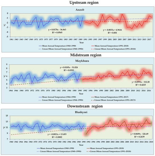 Assessing the temperature values by years at Anzob station in the upstream region, we can say that the predominance of sub-zero temperatures is clearly visible on the graphs and the relative minimum is below zero (Figure 3). General temperature monitoring for the period 1990–2018 showed that the trend line is in the mode of stable sub-zero temperatures. Additionally, small temperature spikes in 1998 and 2006, when the temperature jumped out of the zero mark, showed us relative anomalous years.