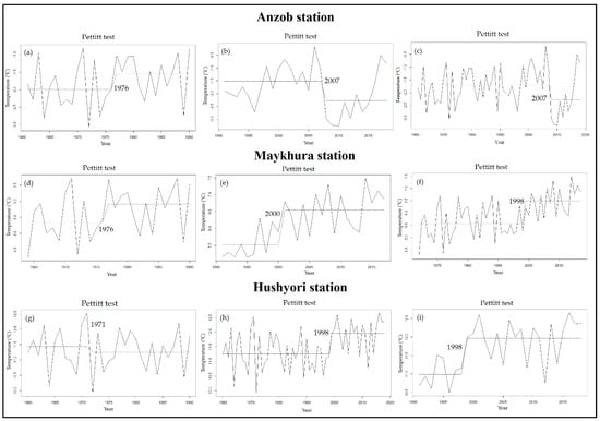 The mean annual temperature change points during the (a,d,g) 1960–1990, (b,e,h) 1991–2018, and (c,f,i) 1960–2018 periods based on the Pettitt’s test at Anzob, Maykhura, and Hushyori meteorological stations in the upstream, midstream, and downstream regions of the Varzob River Basin in Tajikistan.