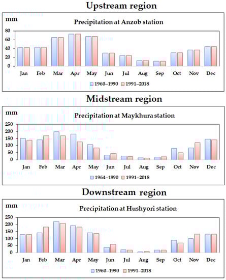 Figure 5 indicates the monthly precipitation changes in upstream, midstream, and downstream areas of the VRB. The annual amount of precipitation is 494 mm at Anzob station. The Anzob region is characterized by an annual course of precipitation reaching its minimum in August–September and its maximum in March–May. Annually precipitation mostly (44%) falls in the spring, 26% falls in winter, and 13–17% falls in the summer and autumn months. The average annual relative humidity is 65% and the average monthly ranges from 50 to 80%. Considering the second period (1991–2018), we can say that the period of precipitation has partially changed in temporal precipitation, as there was an increase in precipitation in February and March and a decrease in April. In mountainous terrain, precipitation forms mudflows on the river during the periods of late autumn and during spring floods.