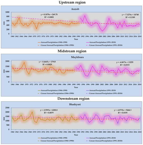Table 5 presents the results of the annual precipitation trend, slope, and change points in the three meteorological stations in the VRB. In the Anzob station, a significant negative trend in the annual precipitation was found in the upstream region during the periods of 1991–2018 and 1960–2018, while a non-significant positive trend was indicated during the period 1960–1990. According to the conducted analysis, in the Maykhura station (midstream region), precipitation during three historical times periods indicated a significant decreasing trend. Our result for the annual precipitation analysis presented a significant decreasing trend during the period of 1991–2018 at the Hushyori station, while from 1960 to 2018, the annual precipitation was found to have a slightly increasing trend in this region.