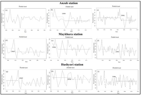 The annual precipitation change points during the periods of (a,d,g) 1960–1990, (b,e,h) 1991–2018, and (c,f,i) 1960–2018 based on the Pettitt’s test at Anzob, Maykhura, and Hushyori meteorological stations in the upstream, midstream, and downstream areas of the Varzob River Basin in Tajikistan.