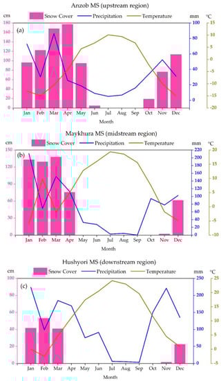 We analyze the period of the accumulation of snow cover in the lower parts of the Varzob river. At Hushyori station, the maximum increase in snow cover occurs in February, when the maximum snow height reaches almost 54 cm (Figure 8c). These data are considered the average value for three rails installed at the meteorological site. Snow cover is observed all year around for almost five months and the low-water period is considered to be almost zero (with possible slight precipitation in the form of rain) for only seven months. Snow cover appears in the last ten days of November and is practically unstable. Wet-dry snow begins to accumulate in December when the night temperature is firmly in below zero.