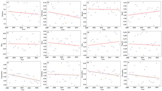 Mann–Kendall trend analysis p-value information based on the spatial-temporal analysis in the Varzob River Basin in Tajikistan from 2001 to 2022. Note: (a) January; (b) February; (c) March; (d) April; (e) May; (f) June; (g) July; (h) August; (i) September; (j); October; (k) November; and (l) December.