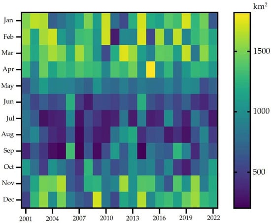 The Y axis represents the months of the year and the X axis represents the years. The colors in the heatmap indicate the amount of snow cover, ranging from low (dark colors) to high (light colors), with a range of 0–2000 km2.