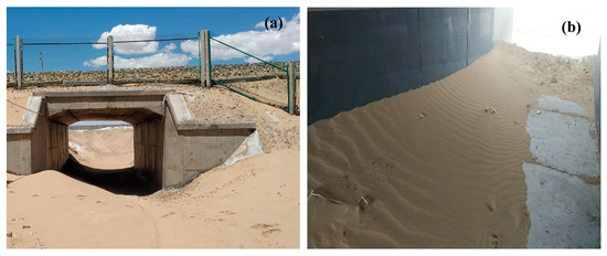 Sand sedimentation around railway culverts, (a) at entrance of a culvert on the Qinghai-Tibet Railway, and (b) inside a culvert on the Golmud-Korla Railway [18].