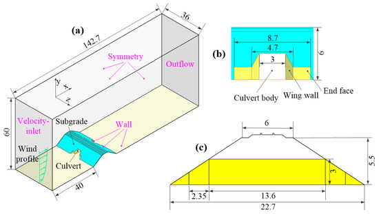 A railway culvert is composed of the culvert body, wing walls, and end faces. The culvert body is typically rectangular, the wing walls are isosceles trapezoid (top view), and the end faces are vertical skirt. The culvert structure and size in desert areas conform to the TB 10002-2017 Code for Design of Railway Bridges and Culverts [25]. A three-dimensional model of the railway culvert was established. The dimensions were 13.6 m (length) × 3 m (width) × 3 m (height), the subgrade was 22.7 m (length) × 36 m (width) × 6 m (height), and the slope was 1:1.75. The simulation domain was 142.7 m long, 36 m wide and 60 m high. The culvert was located 40 m from the start of the simulation domain to ensure a sufficient distance for wind-blown sand accumulation. The simulation domain, subgrade, and culvert model are shown in Figure 2.