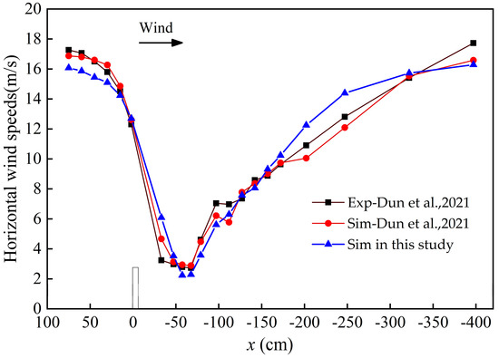 A calculation case of three-dimensional flow field of convex subgrade with wind-break walls was established, which was the same as the wind tunnel experiment in Dun et al. [27] to verify the accuracy of the parameter settings in the numerical model of the culvert. The horizontal wind speed around the subgrade at a height of 15 cm when the inflow wind speed is 20 m/s was compared and analyzed. As shown in Figure 3, the numerical simulation in this study was basically consistent with the experimental and simulation results in [27], indicating that the parameter settings of the numerical simulation were reliable. The simulation calculation of railway culvert was carried out with the same parameter setting.