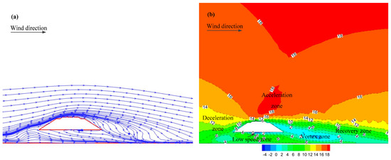Flow field distribution of railway culvert. (a) Streamline diagram and (b) velocity cloud diagram of axial plane in the culvert.