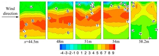To make certain the horizontal wind velocity distribution and variation law of the vertical wind direction cross-section (3 m × 3 m) inside the culvert, Figure 5 shows the wind velocity cloud diagram at different positions of the culvert body in the x direction. It can be seen from Figure 5 that when x ≤ 54 m, the horizontal velocity had obvious stratification characteristics, and as the height increased, the velocity in the culvert body increased first and then decreased. The sequence is the airflow sub high speed zone, high speed zone, and low speed zone. The above phenomenon was fully consistent with the fluid boundary layer theory, that is, the viscous force of the airflow away from the culvert wall gradually decreased, the airflow velocity increased continuously, and finally the maximum velocity was reached in the middle of the hole. In addition, it was also found that as the position of the cross-section inside the culvert continuously shifted to the right, that is, the depth of the culvert body continued to increased, and the high-speed area of the airflow gradually moved up. When x = 58.2 m, the horizontal velocity at the culvert outlet was not stratified, and the airflow velocity was significantly lower than that of x = 54 m section. The main reason was that the wing walls structure of the culvert outlet increased the cross-sectional area, resulting in rapid decreased in airflow pressure and wind velocity.