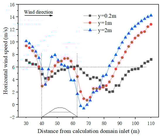 Figure 6 shows the change in the horizontal wind speed from the windward side to the leeward side of the subgrade. The wind speed in the culvert had a range of 30–110 m at heights above the ground of y = 0.2, 1, and 2 m.