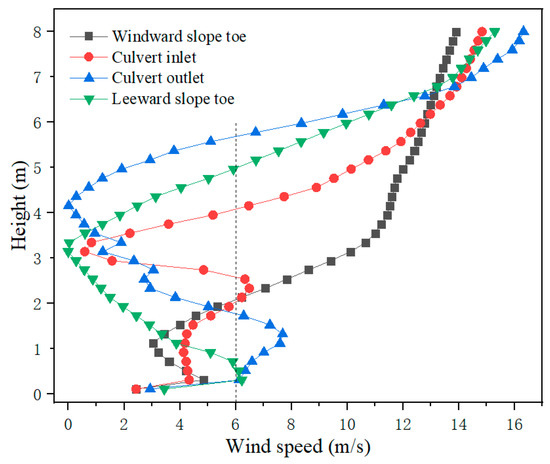 Figure 7 shows the wind speed profiles at different positions of the culvert axis. In general, the wind speed increased, decreased, and increased as the height y increased. The lowest wind speed at the culvert inlet, outlet, and leeward side slope toe occurred at the height of 3–4 m, and were about zero. The main reason is that the airflow on the windward and leeward sides is blocked by the subgrade when y exceeds the culvert height. When y < 2 m, the wind speed at the other locations are less than 6 m/s, except at the culvert outlet, indicating that the culvert outlet is a high wind speed zone.