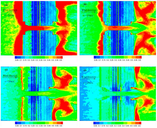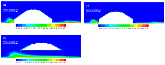 Figure 10 shows the sand volume fraction around the culvert (bottom view) at different inflow velocities. The kinetic energy of the airflow and the sand transport capacity were lower at v = 10 m/s than at v = 15 m/s (Figure 10b), resulting in a higher sand volume fraction on the windward side of the subgrade, the inlet and inside of the culvert, and the track. The kinetic energy of the airflow and the sand transport capacity were higher at v = 20 m/s than at v = 15 m/s. Most of the sand particles in front of the culvert were transported to the leeward side of the subgrade; thus, the sand volume fraction was low in the culvert. Moreover, a small amount of sand was transported to the middle of the windward slope of the subgrade and deposited in strips. The sand volume fraction on the windward side of the subgrade and inside the culvert was the lowest at v = 25 m/s. The sand at the leeward side was far away from the subgrade. In summary, an increase with the inflow velocity resulted in more sand being transported. The sand volume fraction in the culvert was lower at v ≥ 20 m/s than v ≤ 15 m/s, markedly.