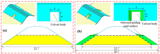 Two culvert models are proposed: straight and protruding, as shown in Figure 11. They are designed to improve the structure of the original culvert and minimize sand accumulation. The straight culvert does not have wing walls or end faces. The protruding culvert includes a section that deflects the sand to the outside of the culvert. The same numerical simulation settings were used to evaluate the proposed culverts’ performances in reducing sand deposition.