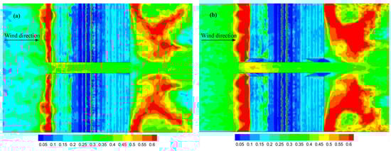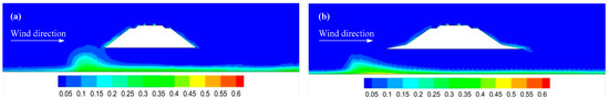 Figure 12 shows the sand volume fraction of the two culverts (bottom view) at an inflow velocity of 15 m/s. The sand volume fraction of the new culverts was significantly lower than that of the original culvert (Figure 10b). The main reason is that the new culverts do not have wing walls, and the sectional area of the culvert inlet is smaller, reducing the possibility of sand sedimentation in the culvert. In addition, the sand volume fraction at the inlet was low for the new culverts, and there was almost no sand sedimentation at other places inside the culvert. The sand volume fraction was the lower inside the straight culvert. As shown in Figure 12a, the sand inside the straight culvert accumulated close to the inner wall of the culvert, and the sand sedimentation on the leeward side was far away from the slope toe. Figure 12b shows that the protruding culvert did to deflect the sand. Instead, the sand volume fraction was high at the culvert inlet. The likely reason is that the longer length of the protruding culvert changes the flow field distribution and reduces the airflow velocity at the culvert inlet, increasing the sand deposition level.
