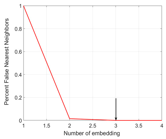 This section introduces the false nearest neighbor algorithm according to the idea proposed by Kennel et al. [32]. Let us assume that two data points in a one-dimensional time series are close to each other—then they are neighbors. Their difference in magnitude gives us the distance between these neighbors. If we embed this time series (first in two dimensions) with a certain time delay, tau, then we can use the coordinates of these data points to examine whether the distance between them has changed significantly. If this embedding has changed the distance between the neighbors significantly, they are false neighbors, indicating the need for further data embedding in subsequent dimensions. In case the distance between them does not change significantly, they are called true neighbors. At that point, the embedding leaves the attractor shape unchanged, which means that the current embedding dimension is sufficient. The procedure repeats successively by increasing the embedding dimension D. The value of D is chosen at the point where the number of FNN falls to 0 (Figure 2).