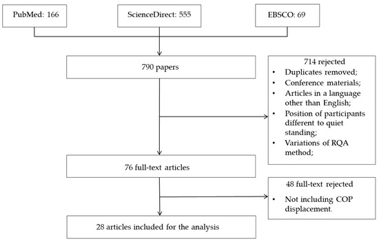 The initial process of screening the electronic database yielded 790 papers. Screening of titles and abstracts led to the rejection of 714 articles. The approval of 28 studies was obtained after eliminating duplicates and publications with irrelevant measurement methods. The steps of the reviewing process are shown in Figure 3.
