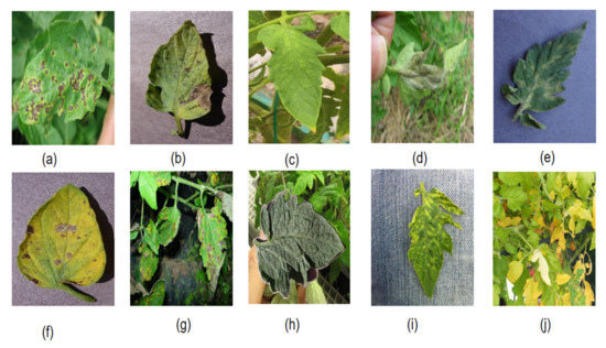 (a–j) in the figure represent ten different tomato leaf species, respectively: (a) Tomato___Bacterial_spot; (b) Tomato___Early_blight; (c) Tomato___Late_blight; (d) Tomato___Leaf_Mold; (e) Tomato___Septoria_leaf_spot; (f) Tomato___Spider_mites Two-spotted_spider_mite; (g) Tomato___Target_Spot; (h) Tomato___Tomato_Yellow_ Leaf_Curl_Virus; (i) Tomato___Tomato_mosaic_virus; (j) Tomato___healthy.
