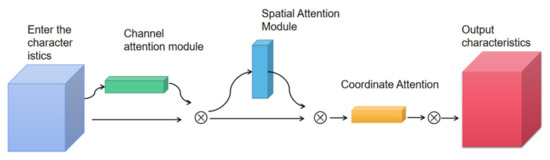 Tomato leaf diseases pose several challenges, such as small disease targets, subtle differences between different types of diseases, and unclear disease features. To address these issues, we developed a three-channel attention mechanism module that enables the model to capture subtle disease features and focus on specific disease locations. This module effectively suppresses the negative impact of interfering information, such as leaves and background, on the model, which in turn enhances the model’s robustness. The three-channel attention mechanism module, depicted in Figure 3, consists of a spatial attention module, a channel attention module, and a coordinate attention module, which are connected to produce the final output.
