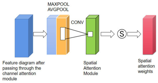 The Spatial Attention Module is a channel compression technique that performs average pooling and max pooling separately in the channel dimension. Specifically, the MaxPool operation extracts the maximum value in the channel, with the number of extractions being the product of the height and width. Meanwhile, the AvgPool operation extracts the average value in the channel, with the number of extractions also being the product of the height and width. Subsequently, the feature maps extracted earlier (each with a single channel) are combined to obtain a 2-channel feature map that is utilized to locate the specific position of the disease. The module structure is illustrated in Figure 5. The Spatial Attention Module can be mathematically expressed as Equation (2).