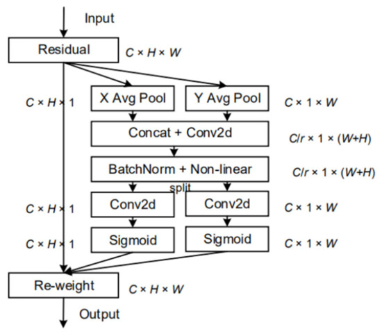 The Coordinate Attention Module operates in three steps. First, the input feature maps are pooled in horizontal and vertical directions using 1D global pooling to generate two separate feature maps through aggregation. Next, the two feature maps with specific direction information are encoded to generate attention maps. Finally, the two attention maps are multiplied with the input feature maps to achieve the goal of emphasizing the coordinate information representation. The Coordinate Attention Module is depicted in Figure 6.