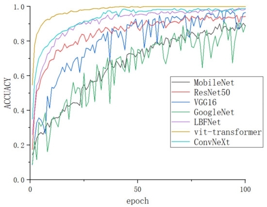 As shown in Figure 9, GoogleNert and MobileNet, as early lightweight models, have fewer parameters and simple structures, but the same training time increases accordingly and cannot achieve a complete fit after 100 rounds, while VGG16, although simple but with a huge number of parameters and large fluctuations, also does not achieve a fit, and ResNet has the disadvantage of test time, while vit-transformer, ConvNeXt, and LBFNet can reach saturation within a very short number of rounds, but vit-transformer and ConvNeXt have the disadvantages of a large number of parameters, complex structure and long training time of the model, while LBFNet has an accuracy of 0.99. The minimum number of parameters and very simple structure can effectively solve the current problems of low accuracy, large model, long time, and difficulty to deploy on mobile devices for tomato leaf disease recognition models.