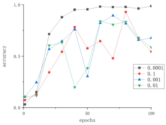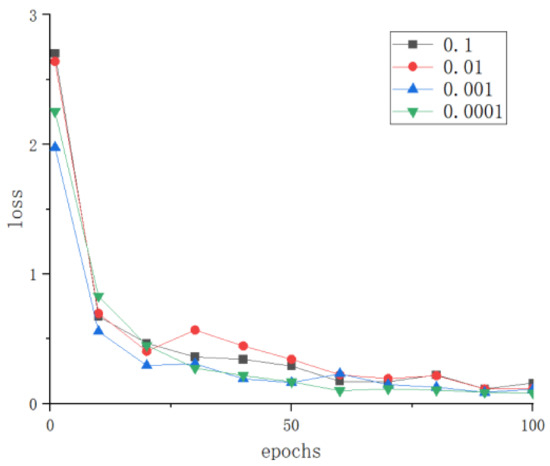 The learning rate is an important hyperparameter of convolutional neural networks. A learning rate that is too large can cause the loss function to miss the global optimal point, while a learning rate that is too small can increase the convergence complexity of the network. Therefore, to explore the optimal learning rate for LBFNet in tomato disease recognition, we conducted experiments with learning rates set to 0.0001, 0.001, 0.01, and 0.1.