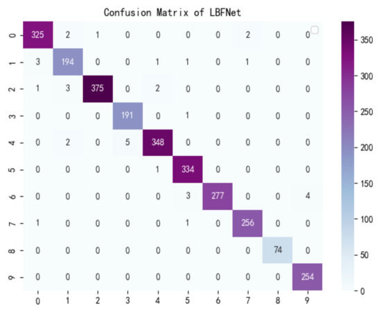 Confusion matrix of LBFNet: 0: ‘Bacterial_spot’,1: ‘Early_blight’, 2: ‘healthy’, 3: ‘Late_blight’, 4: ‘Leaf_Mold’, 5: ‘Septoria_leaf_spot’, 6: ‘Spider_mites’, 7: ‘Target_Spot’, 8: ‘mosaic_virus’, 9: ‘yellow_Leaf_Curl_Virus’.