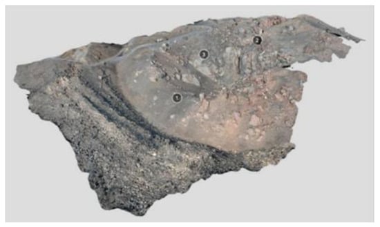3D model of the volcanic crater formed on Nea Kameni volcano in 1570–1573 AD within Santorini Caldera, Greece. Annnotations are as follows: 1. Cone flank. 2. Eruptive fissure. 3. Cone crater. Modified after Pasquaré Mariotto et al. [108].