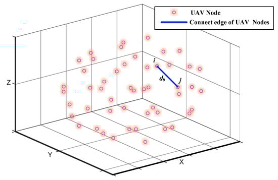 Consider a UAV swarm consisted of N nodes distributed in a 3D Euclidean space, as shown in Figure 1, in which the pink circles indicate the UAV nodes. Let denotes the position of the i-th UAV in the 3D space. indicates the UAV nodes position matrix. The Euclidean distance between the i-th node to the j-th node at moment t is denoted as , where