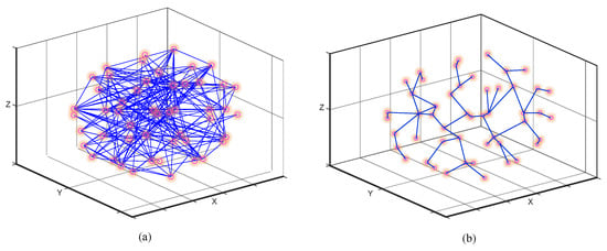 That is to say, the i-th and the j-th UAV nodes are capable of establishing communication link if their distance satisfies the communication distance requirement, i.e., , in which R is the maximum communication range of the UAV. The universal set of network topology of the UAV swarm can be expressed as a time-dependent function of , where . The universal set is determined by node positions matrix and connect-ability indicator matrix . The topology construction step is essentially to find a that guarantees any two UAV nodes in the system reachable through one-hop or multi-hop link. For instant, based on the UAV swarm deployed in Figure 1, a schematic diagram of the universal set and typical topology are shown in Figure 2.