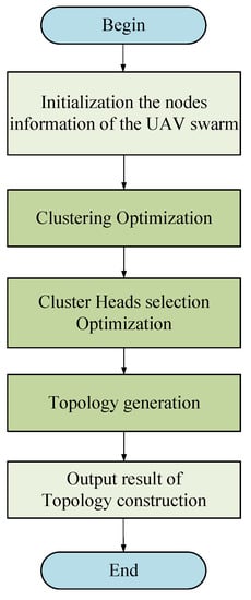 The clustering based topology construction method is well suitable for the UAV swarm networking applications, especially in the large scale swarm scenarios where the number of nodes N is large []. In this paper, a clustering scheme is employed for solving the model in Equations (13)–(19). The construction process of swarm topology is divided into three steps, i.e., clustering, cluster heads selection and topology generation.The flowchart of the proposed GTSC method is presented in Figure 3.