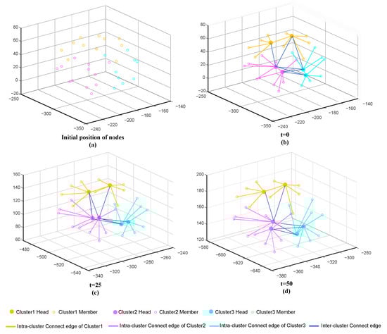 Figure 4 shows the swarm network topology constructed based on the novel group trend similarity based double-head clustering method with . Figure 4a is the initial nodes distribution in the 3D space. As shown in Figure 4b, in the constructed topology, the UAV swarm is divided into three clusters and all nodes are connected through cluster heads. Figure 4c,d is the network topology after a period of operation. It can be seen that when the position of swarm nodes constantly changing, the constructed topology is still able to ensure the connectivity of the network, which proves the effectiveness of the proposed method.