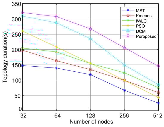To evaluate and analyze the performance of the proposed GTSC method, the classic MST [,], K-means [], PSO-based [,] and the state of the art IWLC [], DCM [] topology construction methods are employed in the simulations for comparison. MST method is a representative topology construction method with fast convergence speed, while K-means is one of the most typical clustering methods for topology construction. On the other hand, PSO-based method is usually used for performance comparison due to its ability to intelligently find approximate optimal solution. The topology duration is also set as the optimization function of PSO method in our simulations. IWLC is a novel location-based K-means++ clustering algorithm where factors included residual energy ratio, adaptive node degree, relative mobility and average distance are considered in clustering process. DCM is a double cluster heads based topology construction method which utilizes the latest swarm intelligence algorithm, PO algorithm for clustering. Moreover, the load balancing of the cluster heads is also considered in the DCM method.