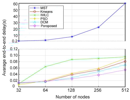 Figure 6 illustrates the comparison of average end-to-end delay when routing packets based on topology constructed by different methods. As the number of nodes increases, the end-to-end delay of the proposed GTSC method becomes increasingly better than that of the other methods. When the number of nodes reaches 512, the end-to-end delay of the proposed method is less than 0.06 s, while the K-means and PSO methods are over 0.08 s, and the DCM is nearly 0.07 s. It can be assumed that as the number of nodes continues increasing, the advantages of the proposed method in terms of end-to-end delay will become more apparent. When the number of nodes is less than 64, the end-to-end delay of MST, K-means, PSO-based, DCM and the proposed GTSC methods is close to the same. With small number of nodes, the benefits of the proposed GTSC method for optimizing the number of forwarding hops cannot be epitomized. As analyzed in the previous sections, the end-to-end delay in the swarm network is mainly determined by the number of forwarding hops, the MST method shows disadvantage, especially when the number of nodes increases. The end-to-end delay of the MST method is almost several hundred times higher than other methods when the number of nodes reaches 128 or more.