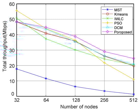 The total throughput of the network topology constructed by different methods under varies number of nodes is provided in Figure 7. As mentioned in Section 3.2, the throughput of network is mainly influenced by the number of forwarding hops and transmission distance theoretically. Simulation results as shown in Figure 7 matches the analysis. When number of nodes reaches 128 or more, the proposed GTSC method can achieve higher total throughput than any other methods due to the consideration of both distance and number of forwarding hops, which shows the advantage of the proposed GTSC method. And it can be assumed that our proposed method will outperform any other methods when number of nodes continue increasing. When the swarm size is small, for example, when N = 32, the PSO method has a better performance than the proposed method. This is due to the fact that the data transmission links constructed by PSO method does not require cluster heads to relay, which leads to lower forwarding hops. When the number of nodes increasing, network topology constructed by PSO method can no longer ensure low forwarding hops, and therefore results in reduced throughput performance.