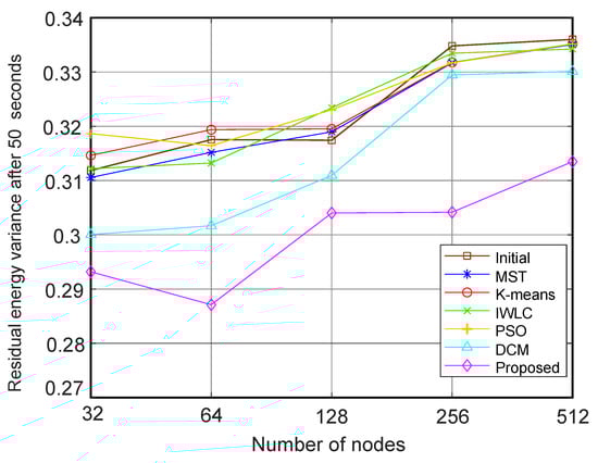 The energy balance of swarm network can be evaluated from the variance of residual energy of nodes. In this simulation, we compared the energy balance ability of swarm network constructed based on various methods from the view of the variance of residual energy of nodes. As shown in Figure 8, the residual energy variance of the proposed GTSC method performs the best compared with other five methods. Regardless of the number of nodes, the proposed method can always achieve lower residual energy variance than the initial residual energy variance. Simulation results indicate that the energy consumption of the nodes is well balanced when the topology is constructed based on the proposed GTSC method. The well performance of the DCM method in terms of residual energy distribution can also demonstrate the advantage of the double cluster heads scheme.