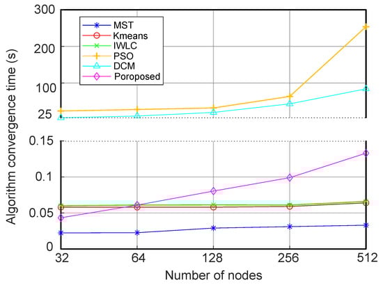 As shown in Figure 9, the increase of number of nodes leads to lower convergence speed, especially for PSO method and PO-based DCM method. When the number of nodes increases, the computational complexity of the PSO and DCM methods increases exponentially, such a convergence performance makes the PSO and DCM methods unrealistic in practical. MST and K-means methods are the most typical and widely used algorithms. The most important feature of MST and K-means methods is their fast convergence, which is confirmed by the simulation results, the convergence time barely varies with increasing nodes. As a result, the K-means++ based IWLC method also achieves good performance in terms of convergence speed. Meanwhile, the simulation results show that the convergence time of the proposed GTSC method continues increasing with the number of nodes but still within acceptable range. The proposed topology construction method will not cause excessive computational complexity and is of practical interest.