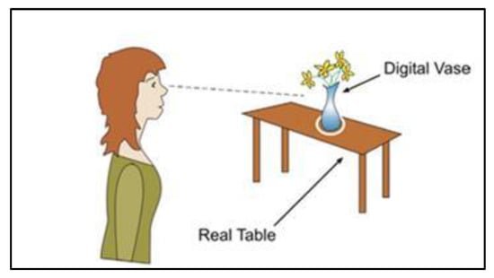The basic element of augmented reality is that information has a physical space or location in the real world. Figure 2 illustrates a digital vase on a real table, meaning that the vase has a location in the real world. If the person moves away from the table, the vase will stay in the same place [23].