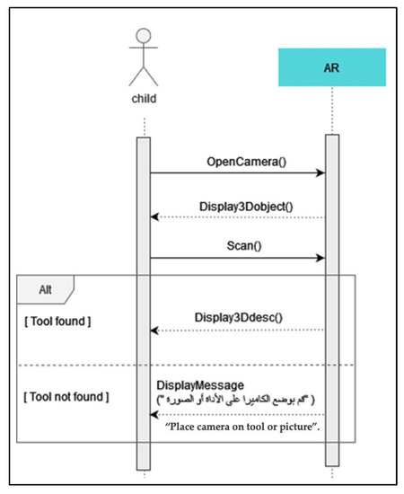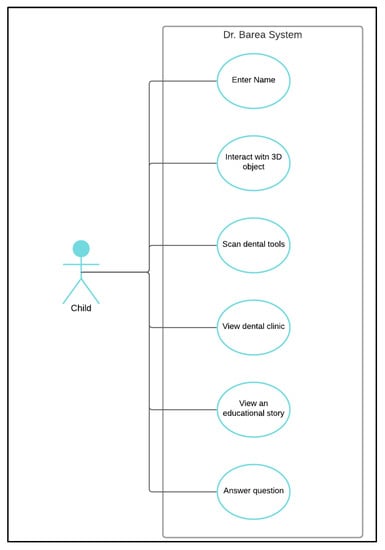 After conducting interviews with experts, monitoring children’s behavior in clinics, and reviewing the related research, we selected the most important eight tools (probe, mirror, dental chair, dental light, air water syringe, toothbrush, explorer, and ultrasonic scaler) for the system. For the toothbrush, we decided to display a video from the Saudi Ministry of Health about the proper technique of teeth brushing [35]. Figure 4 shows a use case diagram that displays the main actions that can be performed by the child within the system. Additionally, Figure 5 illustrates the main functionality of the application, which is to scan the dental tools and their functions.