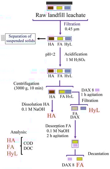 Procedure developed for fractionation of humic substances. HA—humic acids; FA—fulvic acids; HyL—hydrophilic fraction; DAX 8—polymethylmethacrylate resin; DOC—dissolved organic carbon; COD—chemical oxygen demand. Adapted from Dia et al. [35].