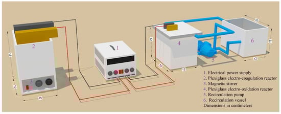Two different plexiglass parallelepiped-shaped reactors were used for EC and EO processes. For the EC process, the dimensions of the reactor were 15 cm × 10 cm × 15 cm, with a useful volume of 1.5 L, and an Fe anode and a stainless-steel cathode with dimensions of 10 cm × 10 cm × 0.4 cm, with an effective area of 160 cm2 each and a distance between electrodes of 1 cm. The dimensions of the EO reactor were 12 cm × 10 cm × 12 cm, with a useful volume of 1.5 L, and a BDD anode and a stainless-steel cathode were used, with dimensions of 7 cm × 5 cm × 0.1 cm, both with an effective area of 60 cm2. The EO process used a filter-press arrangement in an upper frame that held the electrodes (with the option of varying the distance between electrodes at 0.5, 1.0, and 1.5 cm), with a continuous flow of input and output using a recirculation vessel at a rate of 1.5 L min−1. Both the EC and EO electrodes were connected in monopolar mode in parallel to a digital DC power supply Steren PRL258® (Steren®, Mexico City, Mexico) in the batch operation mode (Figure 3).