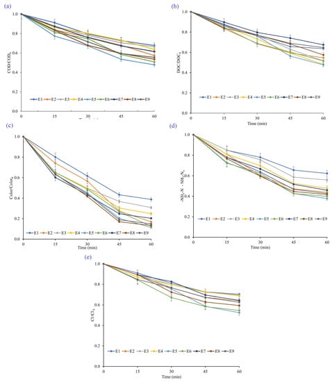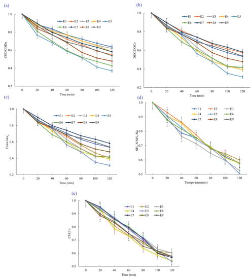 Evolution of the different parameters evaluated in experimental tests of the electro-oxidation process. (a) chemical oxygen demand; (b) dissolved organic carbon; (c) color; (d) ammoniacal nitrogen; (e) chlorides. E—experiments.