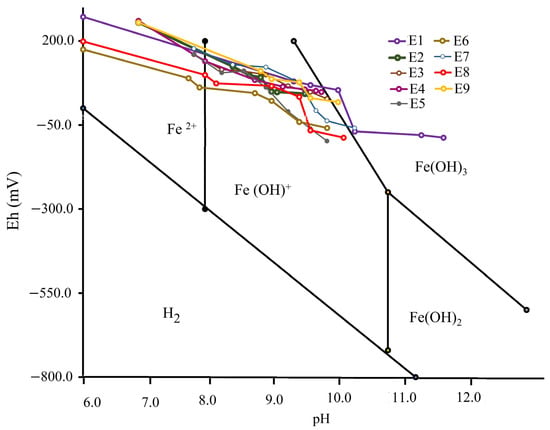 To monitor the EC process, an Eh-pH diagram was developed from t = 0 min to t = 120 min (Figure 6). According to the trajectories, Eh-pH can establish the presence of stable forms of Fe during the process [85]. Ferrous ions (Fe2+) are highly soluble and poorly coagulant and do not adsorb contaminants [23]. The efficiency of the process is enhanced when ferrous ions are oxidized to ferric ions (Fe3+), which occurs when the pH is higher than 5 (that, in fact, was what happened in the experiments), although this oxidation was conducted completely at a pH of 8 to 9 [23,86]. Fe (OH)+ was observed in all experiments.