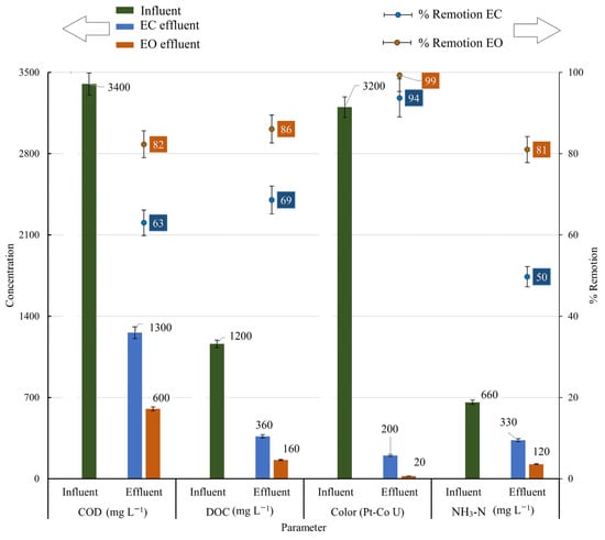 Under optimal conditions (EC I: 4.0 A; RPM: 100; pH: 7; EO NaCl: 1.0 g L−1; D: 0.75 cm. I: 2 A; pH 7), the generated effluent was characterized and the results are shown in Figure 9. The COD, DOC, color, and NH3-N removals for the EC process were 63%, 69%, 94%, and 50%, respectively, and the EO system generated 82%, 86%, 99%, and 81%, respectively. The application of the EO process as an additional treatment to the EC system allowed leaching with a higher level of treatment, achieving increases in COD, DOC, color, and NH3-N removal of 19%, 17%, 5%, and 31%, respectively. An increase was achieved for IB. An IB of 0.26 (BOD5: 300 ± 10 mg L−1) was obtained for EC. An IB of 0.48 (BOD5: 280 ± 10 mg L−1) was obtained for the EO process.