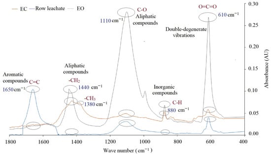 The FTIR spectra allowed the identification of functional groups in the organic matter present in the evaluated sample, providing information on its evolution in the treatment system. In the FTIR spectra shown in Figure 10, a change in the functional groups associated with the removal of organic matter generated by the treatment processes was observed. The peak at 1650 cm−1 could be related to the presence of the C=C bond by an isolated torsion vibration, indicating the presence of aromatic compounds [101], since the matrix under study was leached. This peak was directly related to the presence of humic substances. When evaluating the samples, it was observed that this peak was eliminated by the treatment system, indicating the effectiveness of electrochemical treatments in the degradation of recalcitrant compounds. This could be confirmed by the increase in biodegradable COD in the effluents, as well as the increase in BI. The peaks at 1440 cm−1 and 1380 cm−1 could be associated with the presence of -CH2 and -CH3 bonds caused by deformation vibration [101], indicating the presence of aliphatic compounds in simple bonds. The samples showed an increase in these peaks with the proposed treatment system from zero presence in the raw leachates to very pronounced peaks in the effluents of EC and EO. The effectiveness of the proposed system in the degradation of recalcitrant organic matter was confirmed. The peak at 1110 cm−1 was due to the presence of the C-0 bond caused by the stress vibration of single-chain aliphatic compounds [102,103]. In the effluents evaluated, an increase in this peak was observed from a very small peak in the raw leachate to a very pronounced peak in the EO effluent. The increase in this peak indicated the degradation of recalcitrant organic matter. The peak at 880 cm−1 could be related to the C-H bond of flexion in aliphatic compounds. It was observed that the treatment generated an increase in this peak, starting from a zero peak in the raw leachate to a pronounced peak in the EO effluent. This confirmed the degradation of recalcitrant compounds to compounds with simpler structures [104]. Finally, the peak at 610 cm−1 could have had two distinct origins. The first was the vibration of O-H with an out-of-plane flex [102] or a vibration that was twice degenerated by the presence of CO2. CO2 is a linear molecule that does not rotate around the molecular axis, generating two equivalent normal vibrations, which would be stretching vibrations that would have the same frequency of vibration, precisely causing double degenerate vibration. A possible source of this CO2 in the samples was the presence of air in the samples and, at the time of measurements, there were several people in the laboratory. Although the background spectrum was measured to eliminate residual peaks, this situation occurred.
